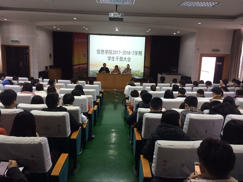 3月5日中午,色漫网 在信息楼五楼报告厅召开了本学期学生干部大会,学院院长助理严水英、学工办主任孙文静、团委书记汪小静以及各学生组织主要负责人,各班班干部100余人参与了会议。 本次会议是新学期的第一次大会,首先就开学初的安全稳定、诚信补考、寝室卫生大扫除等相关工作了做了布置,随后也对本学期的学生工作思路和重点做了沟通与传达,为本学期各项工作的有序开展奠定了基础。