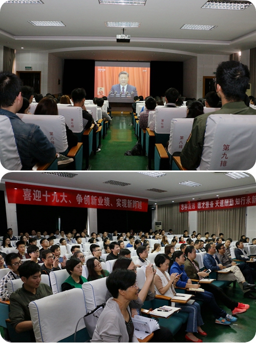 组织师生党员在报告厅,集中收看中国共产党第十九次全国代表大会的开幕式,党员们认真而仔细的听取会议精神,习近平总书记在报告过程中的讲话深刻又有前瞻性,会场内不时不约而同地响起鼓掌声。整个会场里面洋溢着庄重热烈的气氛。
