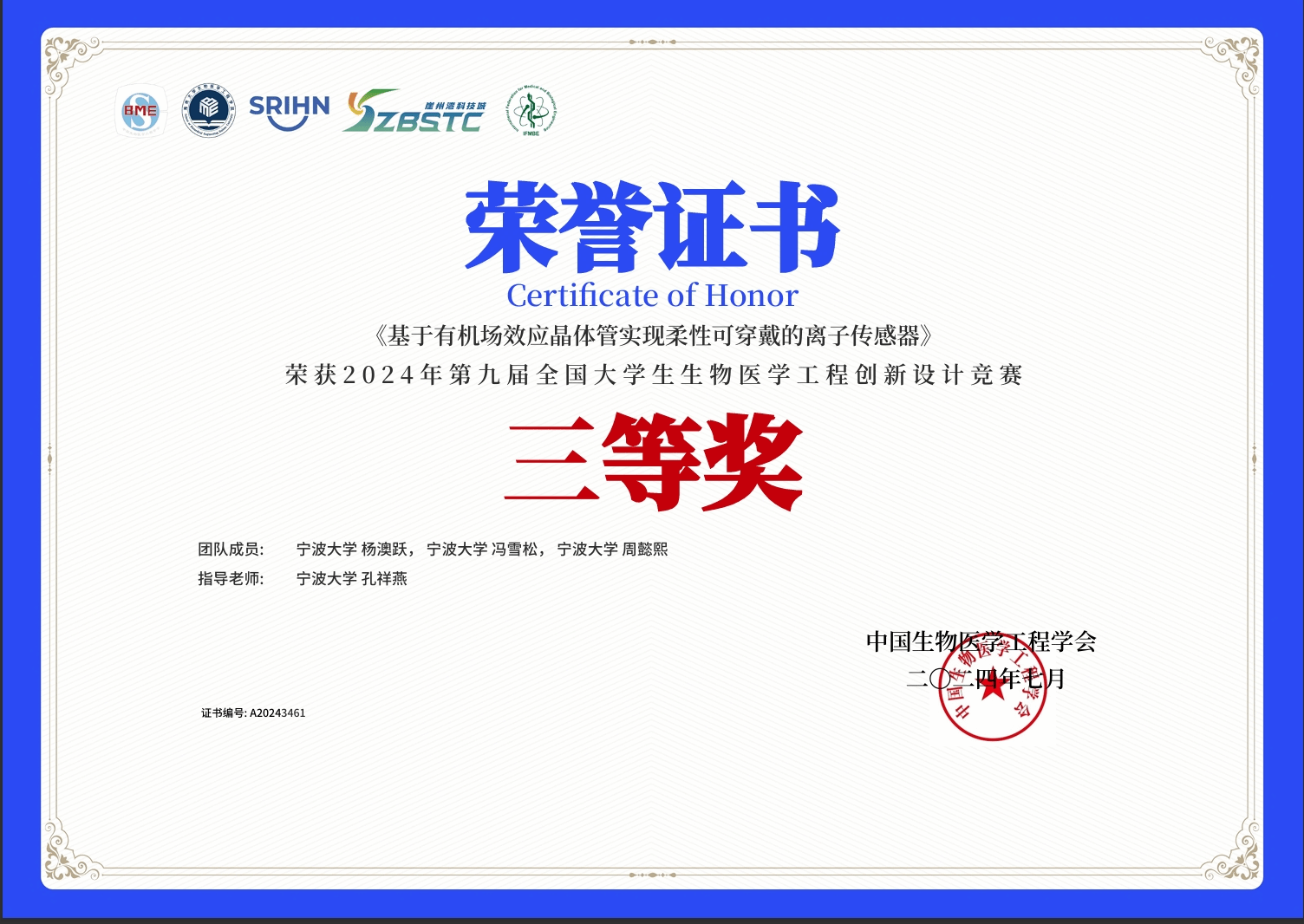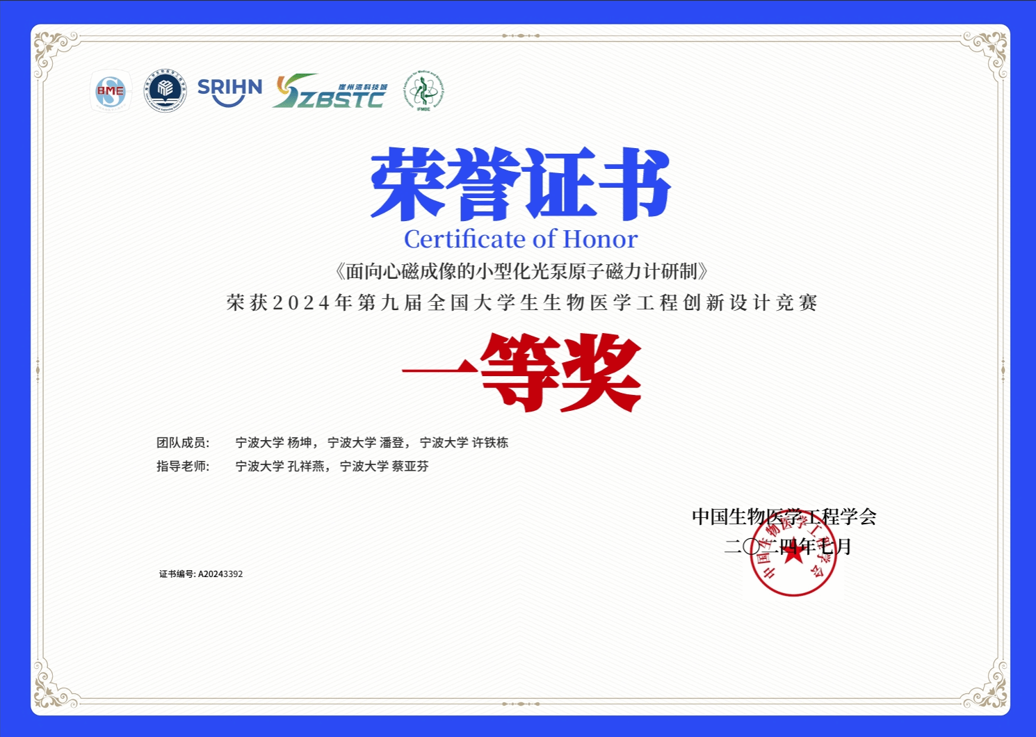 未来无线研究院智能传感及量子精密测量科研平台,在孔祥燕教授、蔡亚芬助理研究员的悉心指导下,共获得一等奖1项,三等奖2项,其中量子探心队(杨坤,潘登,许铁栋)的参赛项目《面向心磁成像的小型化光泵原子磁力计研制》获得一等奖,宁大观光队(杨澳跃,周懿熙,冯雪松)的参赛项目《基于OFET实现柔性可穿戴的人体传感器》,脑源导航者队(魏坤周,周淑琬,林涛)的参赛项目《基于隐马尔可夫算法在癫痫溯源分析中的应用》获得三等奖。