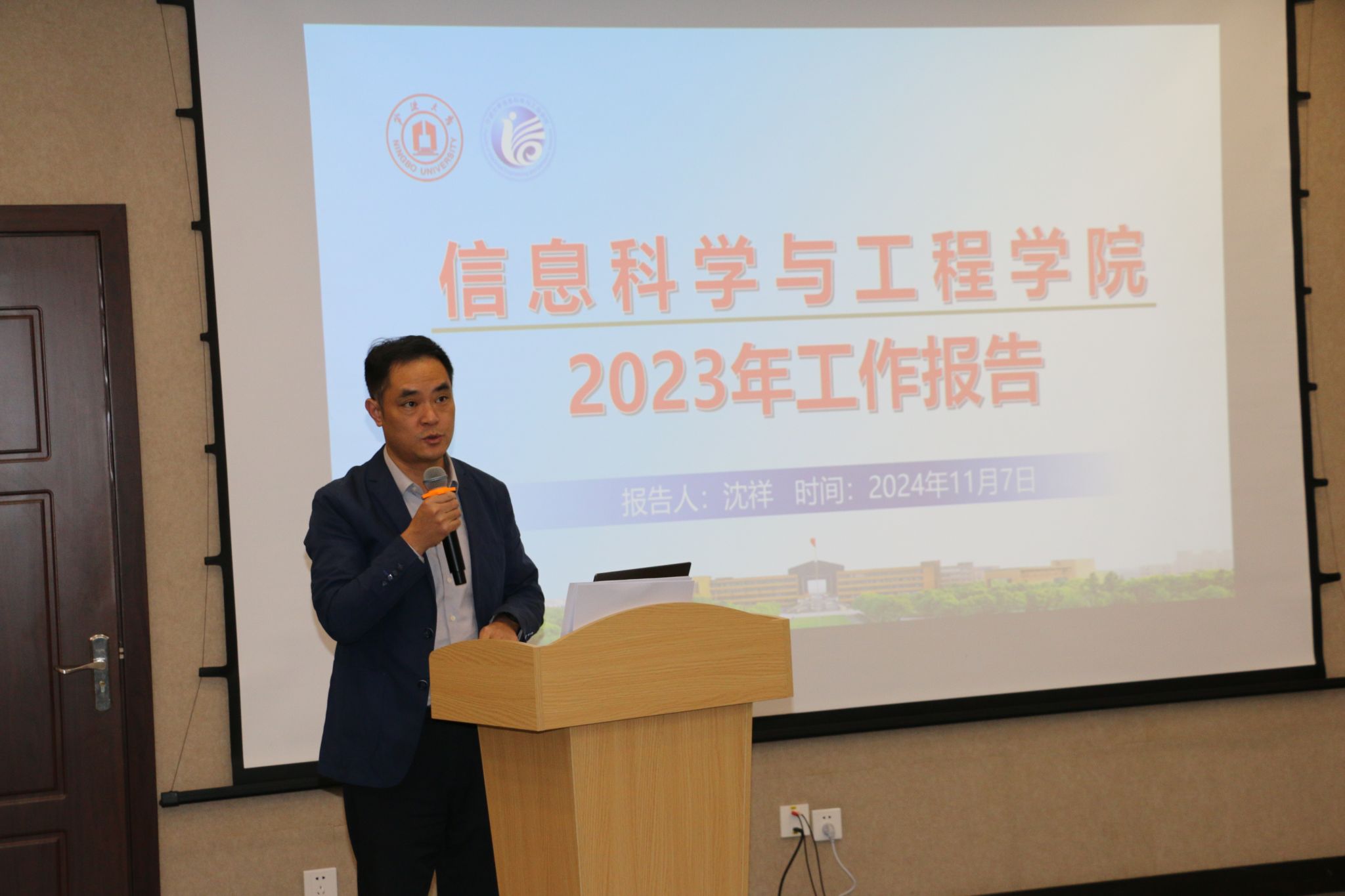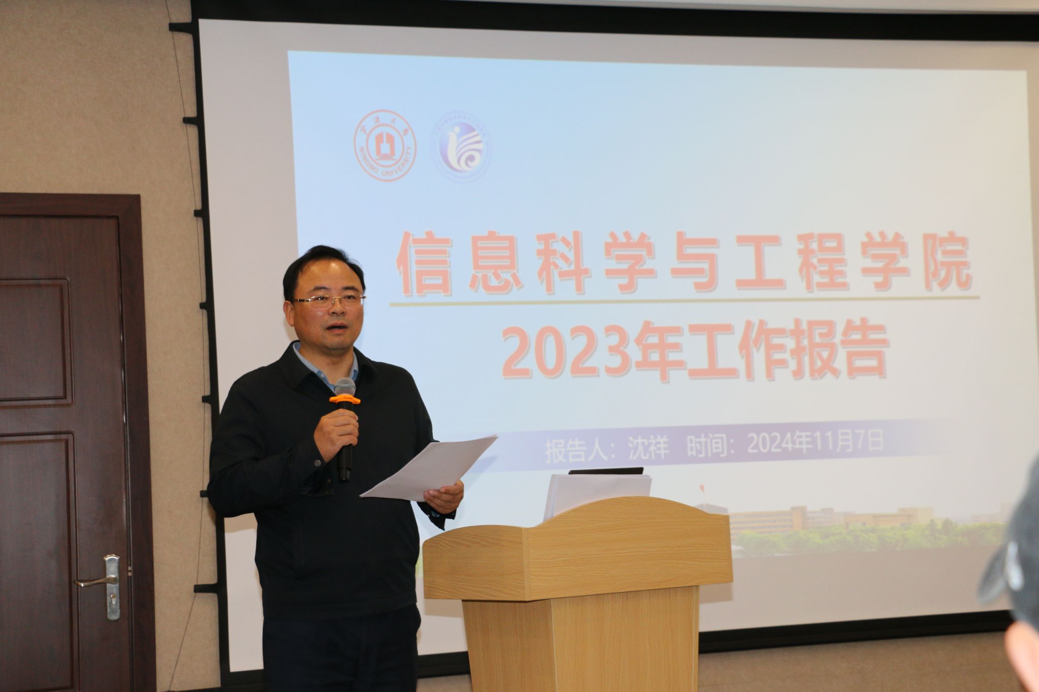 2023年工作报告》工作报告。沈祥以《奋勇争先谋发展 笃行实干谱新篇》为题,全面介绍了2023年学院在党建、教学、学科与研究生教育、科学研究、师资队伍建设、学生工作、对外交流等方面取得的成就。沈祥指出,2023年学院各项工作取得了的较好的成绩,未来,学院要以咬定青山的决心和笃行实干攻坚克难的韧劲实现2024 年的各项目标任务,将学院发展推向新高度。