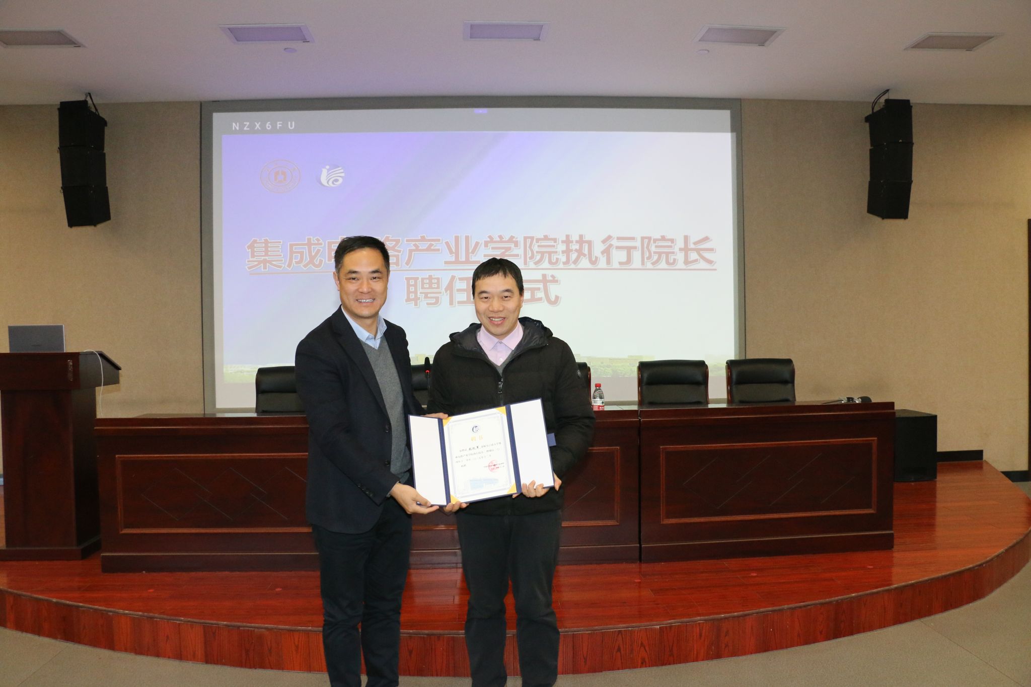 会议由党委书记王伦耀主持,王伦耀首先介绍了2024年下半年人事变动情况,对新入职教职工表示欢迎。为2024年下半年退休教师董建峰教授举行荣休仪式,对董老师35年兢兢业业的付出表示肯定与感谢。随后,举行了集成电路产业学院执行院长聘任仪式,由沈祥院长为产业学院执行院长张跃军颁发聘书。