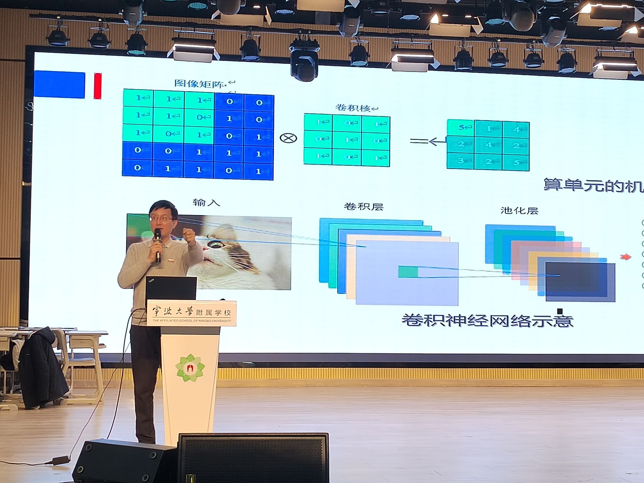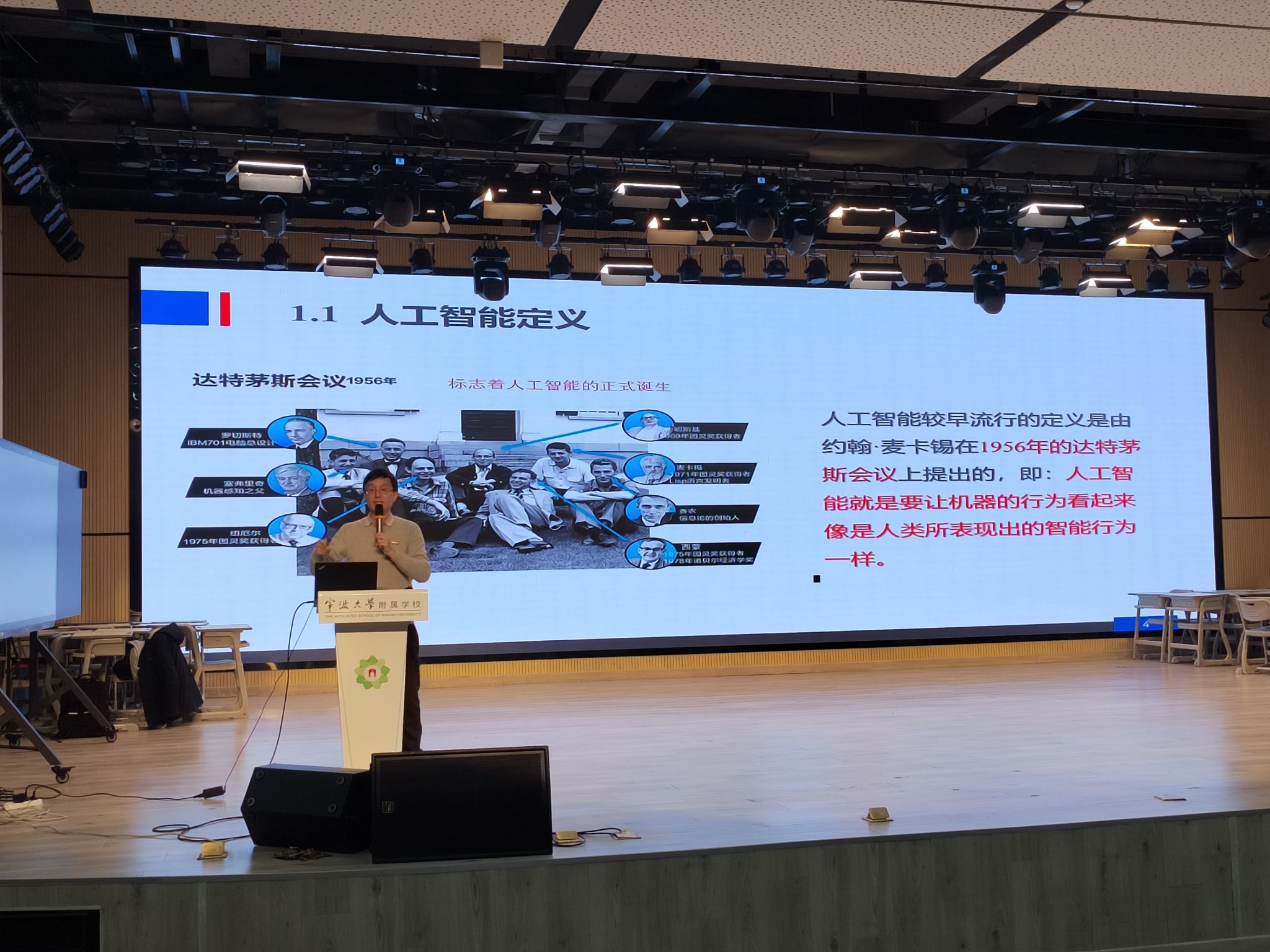 陈老师以“解码智能时代”为主题,系统讲解人工智能(AI)的基础概念与发展脉络。从图灵机原理到深度学习技术,结合神经细胞的科普思路,通过动画演示将符号逻辑、卷积神经网络、强化学习等抽象理论转化为直观认知,并对比人类智能特点,引导学生理解AI的学习与决策逻辑。最后还展示了机器人和无人船系统等人工智能前沿应用领域的发展情况,并通过人工智能与人类智能的对比,引导学生们要学会“自主学习、自我理解、自我归因、自我规划”。