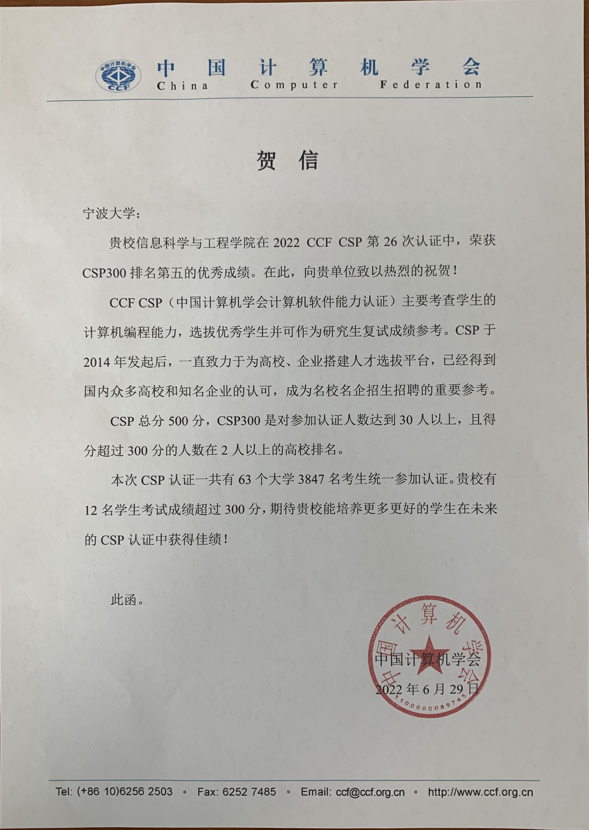 在2022 CCFCSP第26次认证中,荣获CSP300排名第五的优秀成绩。CSP总分500分,CSP300是对参加认证人数达到30人以上,且得分超过 300分的人数在2人以上的高校排名。本次CSP认证一共有63个大学3847名考生统一参加认证。色漫网