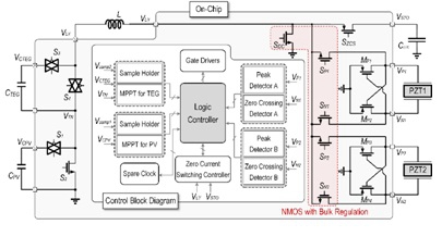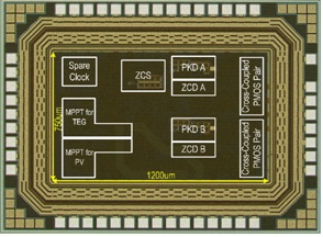 论文提出了一种基于单电感串联堆栈谐振多源能量俘获系统并采用180nm CMOS工艺进行了流片。该芯片融合了一个交流源的同步电荷提取电路和两个直流源的降压-升压转换电路,既可以通过时分复用的模式分别从不同能源收集能量,也可以通过串联堆栈谐振的模式从多个能源同步提取能量。首次实现了电感连续电流模式下的多源能量俘获,主要性能指标达到国际一流水准。图1为芯片架构,图2为芯片显微照片。