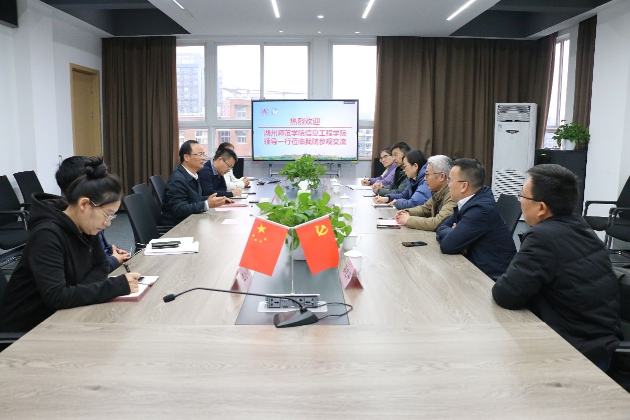 的热情接待和经验分享表示感谢,并就湖州师范学院信息工程学院党的建设、思想政治工作等方面进行详细的介绍,胡文军院长就湖州师范学院信息工程学院发展历程和近年来各方面发展取得的重大进展进行了介绍。