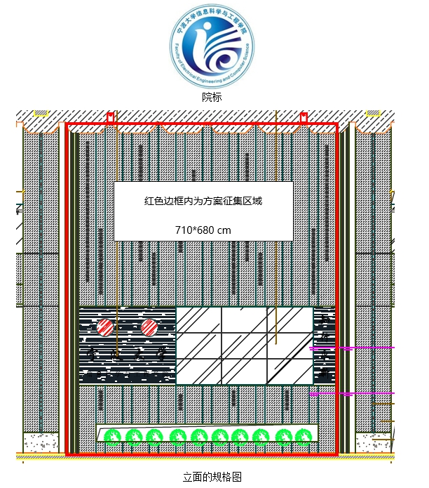 立面的规格如下图所示。红色区域就是本次征集设计方案的区域,高度和宽度为7.1米*6.8米,中间靠下部分的区域目前暂定为院标(如下图所示)、院训(“知行永新”)和大屏幕显示的区域(高1.74米,宽3.07米),其余部分为待设计的区域。